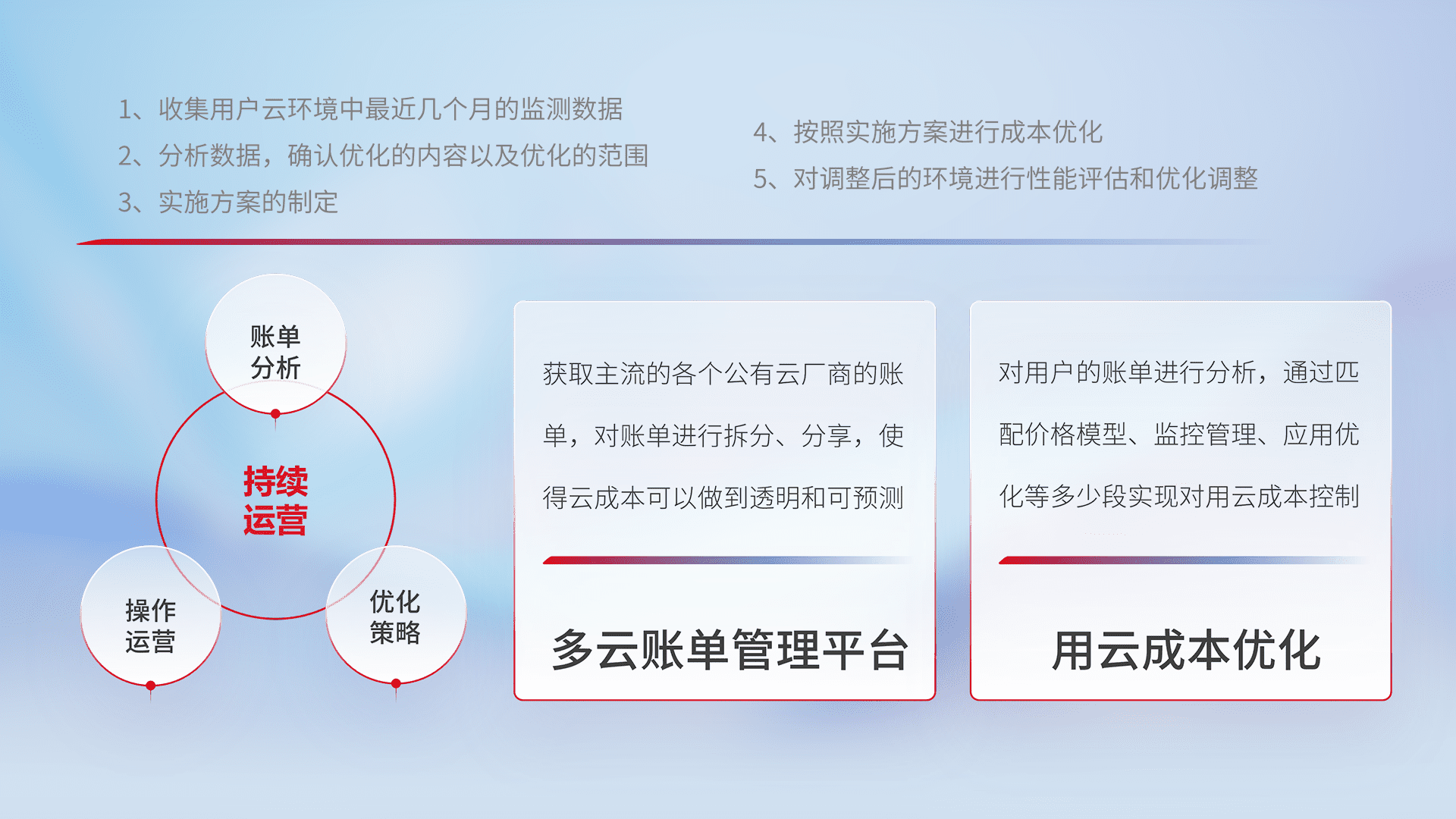 通过多云纳管,,,,以统一的资源数据模型把客户的云资源进行抽象和封装,,,,进而实现对多云资源的统一操作,,,保障云资源管理的可靠性、、、稳定性与可用性。。。。量身定制化运维内容,,,,配置、、开发运维、、、、补丁管理、、、备份、、、、监控、、、、认证和访问管理、、、审计和日常巡检等,,,保障在用云过程中的可靠度,,,,稳定度以及高可用率。。。。